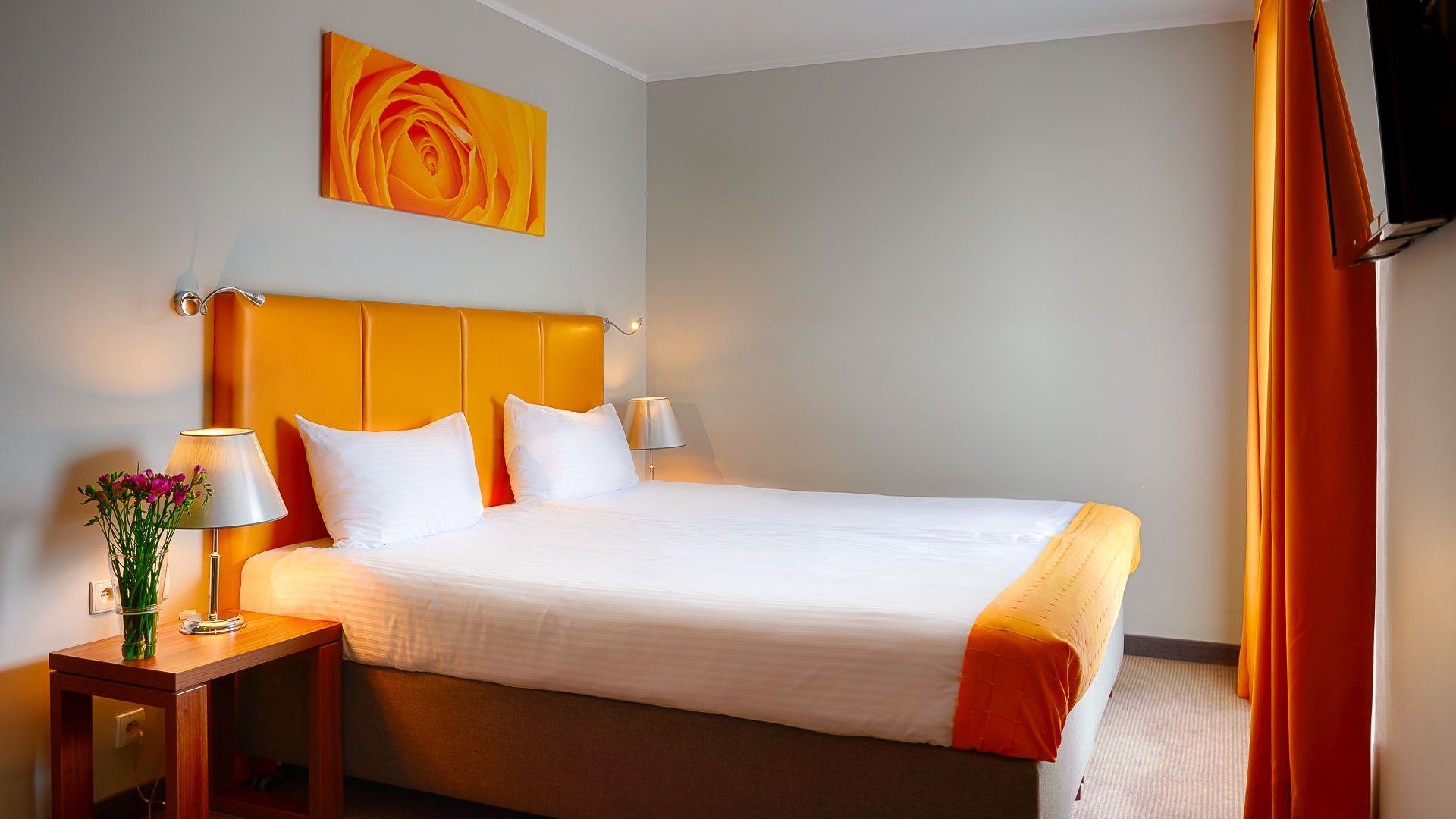Comfortably and functionally designed interior with a comfortable double bed sized 200x210 cm. The modern and bright bathroom is equipped with a shower, hairdryer, and additional mirror. The room features a large work desk, a tea and coffee making set, complimentary mineral water, and an LCD TV with international channels. The room can be completely darkened.