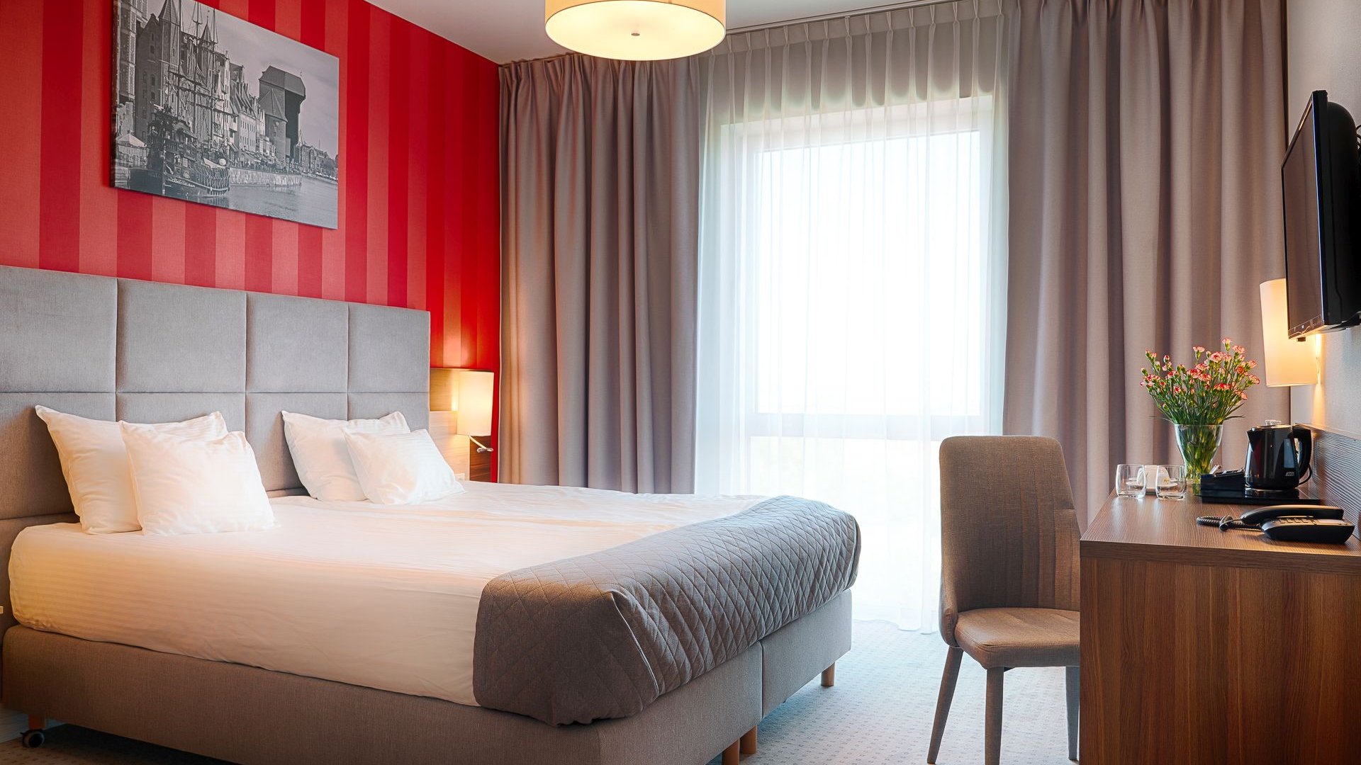 Comfortably and modernly furnished interior with a comfortable double bed measuring 180x200 cm. The bathroom is equipped with a shower, hairdryer, and additional mirror. The room features a large desk for work, a coffee and tea making set, a refrigerator, complimentary mineral water, and an LCD TV with international channels. There is also the possibility of complete room darkening.