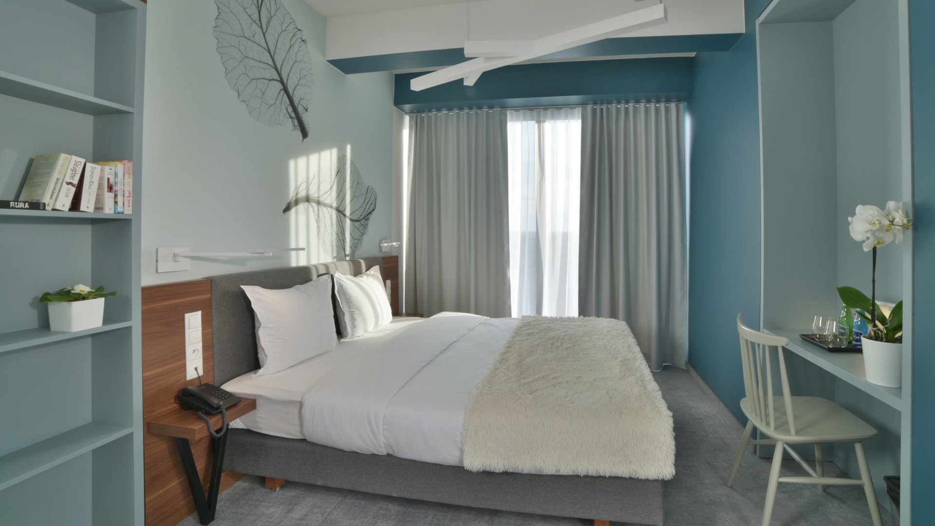 The room is furnished with one large bed, 2 armchairs, a table and a comfortable desk. There is also a spacious wardrobe in the room. Each guest has their own safe and fridge at their disposal. There is a flat-screen TV on the wall in the room. The bathroom has a shower, a set of bathroom amenities and toiletries. Each room has individually controlled air conditioning. The surface of the room is 22 sqm.
