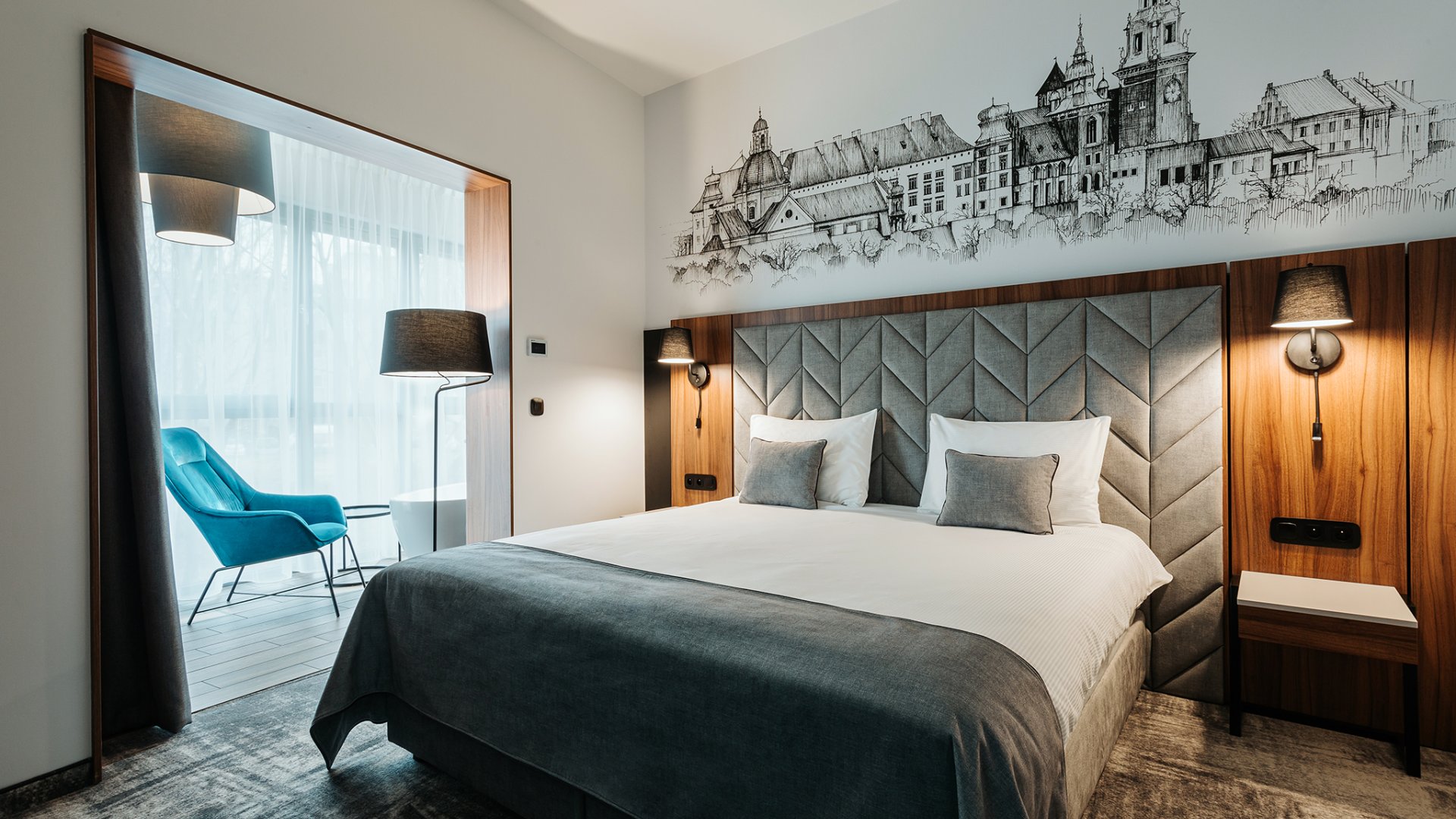 Wyrafinowany, ponadczasowy design zapewnia poczucie przytulności przy jednocześnie dużej przestrzeni. Zadbaliśmy o to, aby pokoje zachwycały klimatem i detalami - przykładem są duże panoramiczne grafiki nad łóżkiem, prezentujące najbardziej rozpoznawalne miejsca i symbole Krakowa. Duże, panoramiczne okna zapewniają dostęp naturalnego światła. W każdym z pokoi znajduje się telewizor, telefon, zestaw do parzenia kawy i herbaty, suszarka do włosów oraz budzik. Zapewniamy również szybki internet WiFi.
