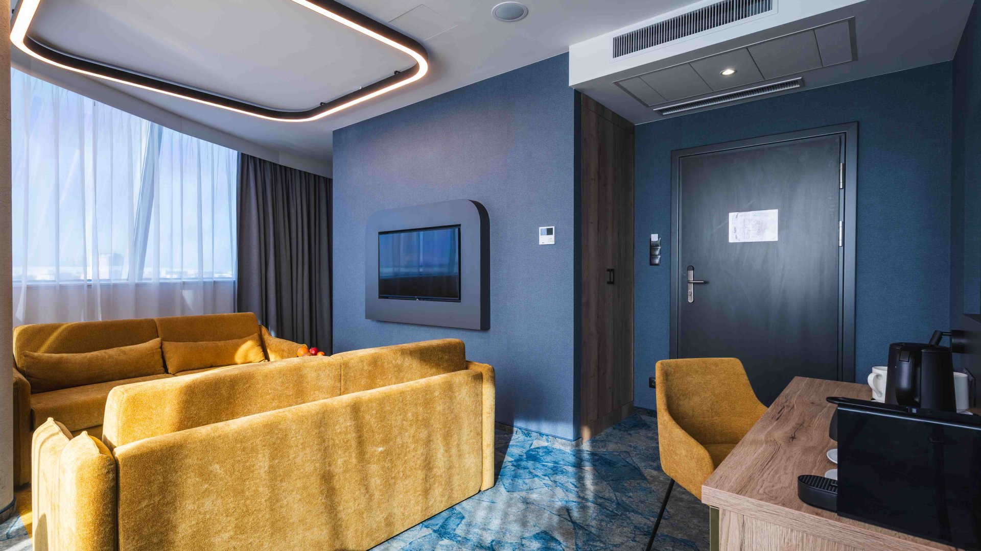Przestronny apartament o powierzchni 48 m² z wydzieloną sypialnią wyposażoną w dwa łóżka o wymiarach 90×200 cm oraz częścią dzienną z rozkładaną sofą. Do dyspozycji gości jest elegancka łazienka z prysznicem oraz dodatkowa, oddzielna toaleta w części dziennej. Apartament idealnie sprawdzi się dla rodzin lub podczas dłuższego pobytu. Wyposażenie obejmuje klimatyzację, zasłony zaciemniające, dźwiękoszczelne wnętrze, biurko z drukarką, zestaw do prasowania, codzienne sprzątanie, szybkie Wi‑Fi, telewizor LCD, sejf, zestaw do parzenia kawy i herbaty oraz wodę mineralną.