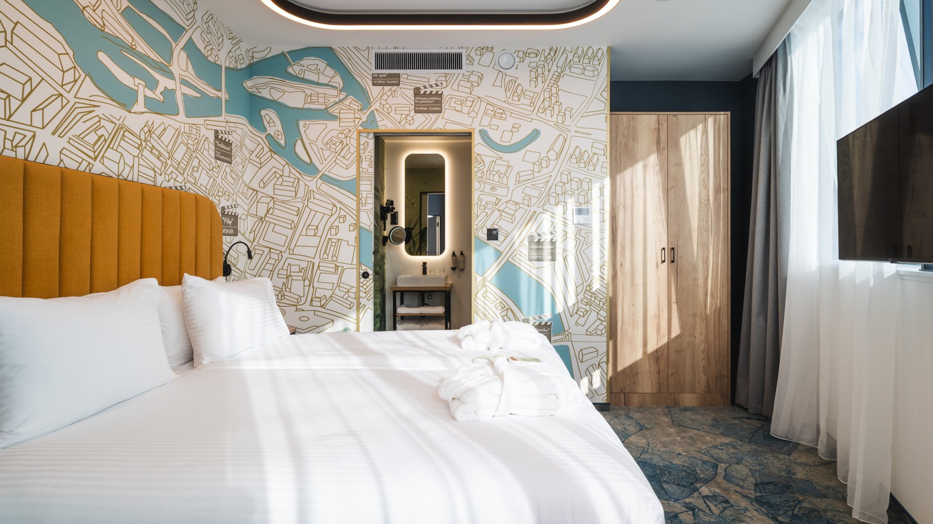 Przestronny pokój dwuosobowy o powierzchni 19 m² i łóżku 160×200 cm. Wyposażenie: klimatyzacja, szybki Internet, telewizor, sejf, zestaw do kawy i herbaty oraz woda mineralna. Elegancka łazienka z prysznicem.