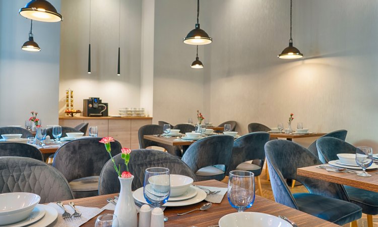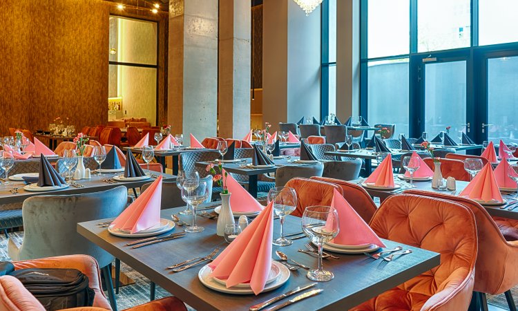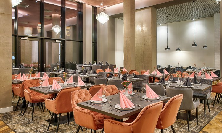 Drewniane podłogi, stonowane kolory i zaskakujący, bogato zdobiony różowy sufit z kryształowymi żyrandolami to pierwsze rzeczy, które rzucają się w oczy gdy wchodzimy do restauracji w Grand Focus Hotel Szczecin. To miejsce mimo swej elegancji sprawia bardzo przytulne wrażenie – zapewne jest to efekt miękkich obić restauracyjnych foteli i zastosowanych tu materiałów wykończeniowych. Patrząc na stylowe wnętrza restauracji, która składa się z trzech niezależnie zaprojektowanych części aż ma się ochotę usiąść przy jednym ze stolików i zamówić kilka pozycji z restauracyjnego menu.